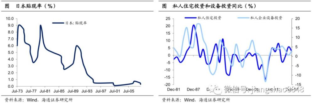 90年代后日本陷入流动性陷阱,货币政策失效。由于房地产泡沫时期日本企业和居民持有了大量不动产,90年代初泡沫破灭之后,房价暴跌导致私人部门资产负债表严重恶化。因此,尽管当时日本政府短时间内大幅下调了基准利率,但是日本私人部门的投资意愿依然持续低迷,私人住宅投资和设备投资同比增速一直在0%左右徘徊。低利率难以刺激私人投资的情况实际上反映出当时日本正处于流动性陷阱,宽松的货币政策基本无效。