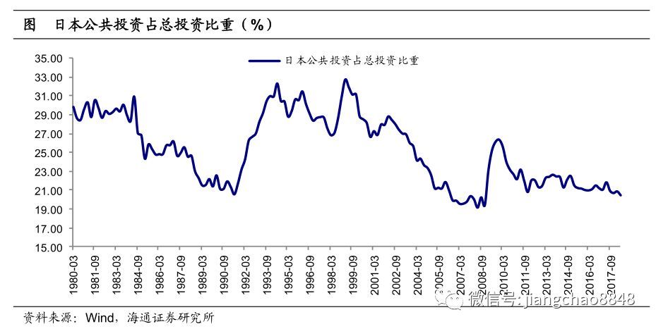 货币政策的困境,使得日本加大了基建投资的财政刺激。由于宽松的货币政策难以刺激经济,日本政府转而采取更加积极的财政政策,而见效最快、最容易的就是政府增加公共支出、扩大基建投资,带动GDP增速回升。无论是上世纪90年代初,98年亚洲金融危机,还是08年美国次贷危机后,日本经济下行之初都以增加政府投资应对,在私人消费和投资遭遇大幅萎缩时,的确有助于帮助经济恢复景气。日本公共投资占总投资的比重从90年代初的21%快速增长到90年代中后期的30%,尽管近几年有所下降,但是占比也维持在20%左右。