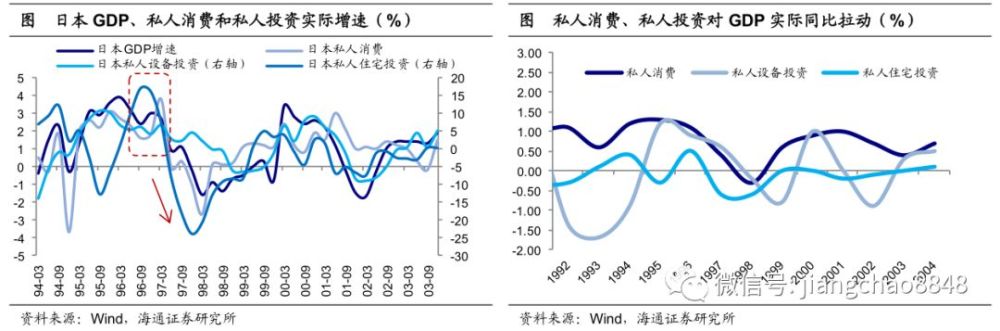 消费税率提高,挤压居民消费与投资。日本的消费税是一种间接税,最终会转嫁给消费者承担。虽然政府也对低收入家庭提供了总规模1000亿日元的临时补助金,但据日本综合研究所的测算,加税在内的一系列财政重建措施还是使日本家庭实际负担增加了8.5万亿日元。加税预期下,96年日本出现了突击消费、建房和投资,以避免之后税负增加,在正式开始加税的97年4月前,日本的私人住宅同比增速一度冲高到17%,私人设备投资、私人消费实际增速分别达到6.6%和3.8%,而在加税冲击下,97年日本的私人消费、私人住宅和设备投资对GDP增速的拉动都出现了下滑。
