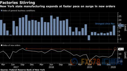 2月18日公布的数据显示,纽约州制造业在2月份加速扩张,达到去年5月以来的最高水平,因订单和出货量激增。这份报告还显示,纽约联储的整体企业活动状况指数从1月的4.8攀升至12.9。订单指数飙升至2017年9月以来的最佳水平,而出货则升至2018年以来最高。