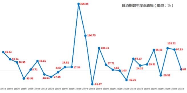 数据分析图看出,白酒跑输多数板块的年份是2013年,当时在103个板块中垫底。大幅跑输多数板块的年份还有1998年至2000年,其他年份均有不俗的市场表现。