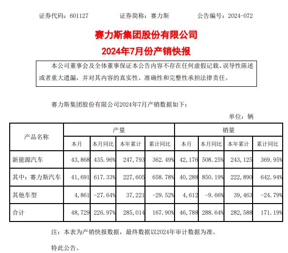 8月1日,赛力斯公告,7月新能源汽车销量4.22万辆,同比增长508.25%。其中,赛力斯汽车销量4.03万辆,同比增长850.19%。